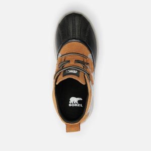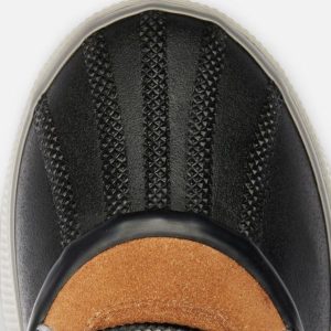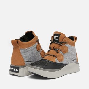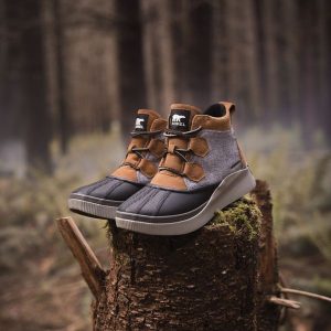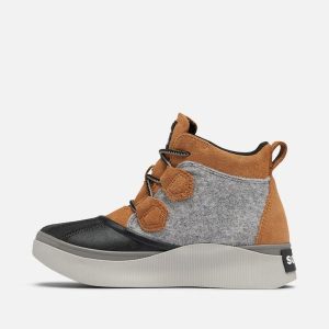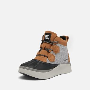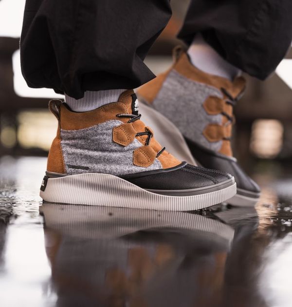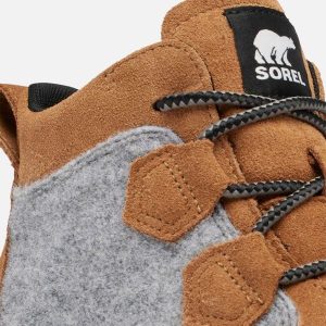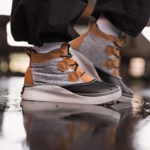 - UPPER: Waterproof materials. Full grain leather and suede upper, felt and suede upper or suede with houndstooth textile. Heel pull tab. Lace closure. Textile lining. Waterproof bootie construction. Waterproof vulcanized rubber shell. Laces are not waterproof.